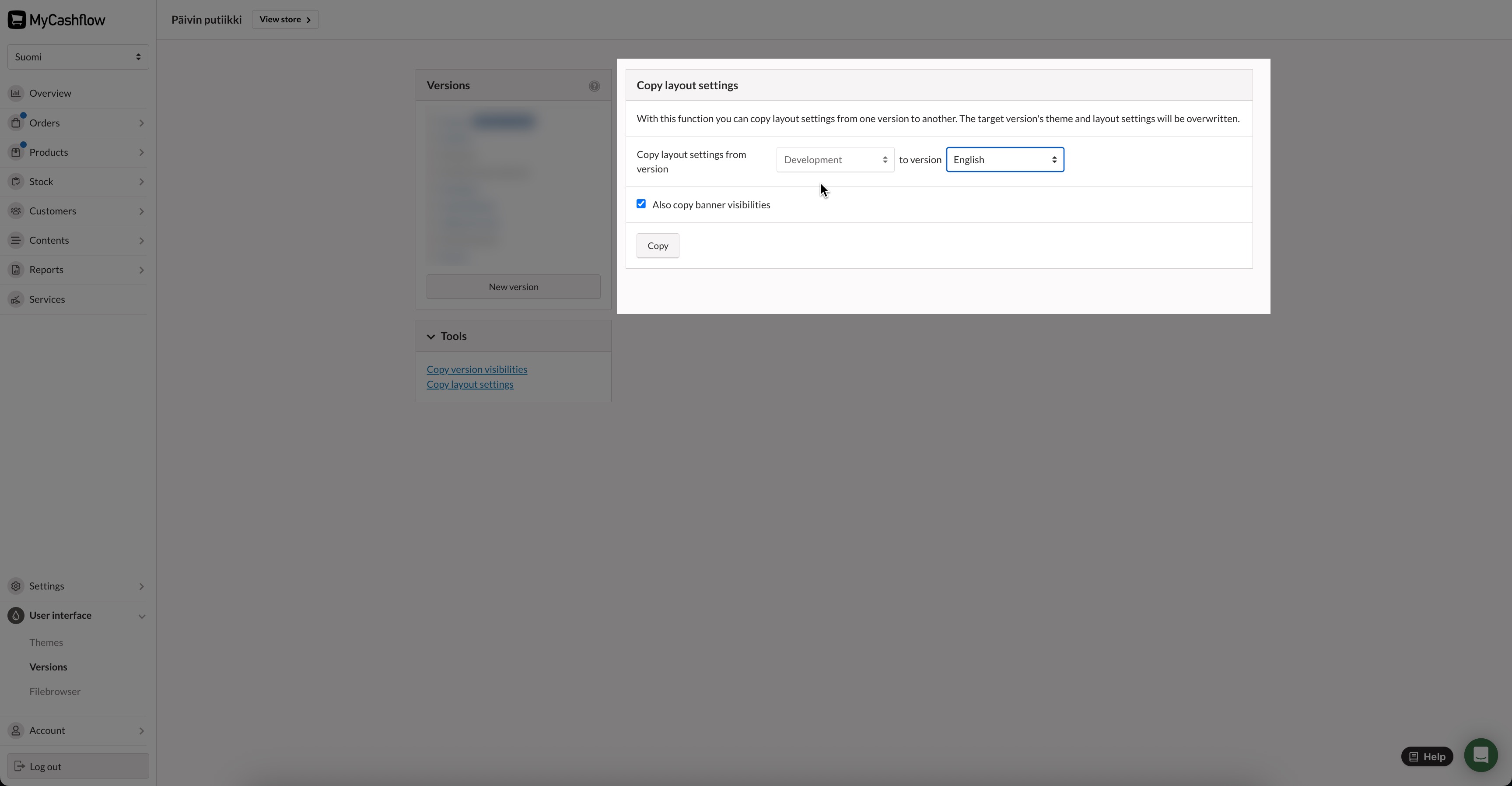 You can easily copy the theme settings, layout structure you created with the layout editor, and banner visibilities from one store version to another. This enables the development of the theme to completion in a hidden store version, and the effortless transfer of changes to the public online store.