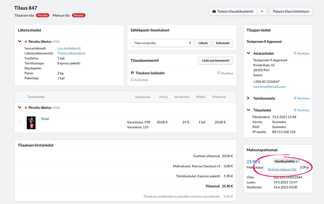 Voit varmistaa, että maksun tila hallintatyökalun tilaussivulla on ajan tasalla painamalla maksutapahtuman työkaluvalikossa olevaa Tarkista maksun tila -linkkiä:
