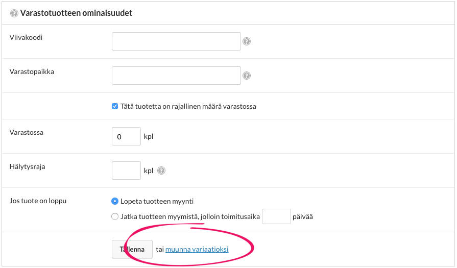 - Varastossa: Syötä tuotteen varastosaldo eli varastossa oleva kappalemäärä.